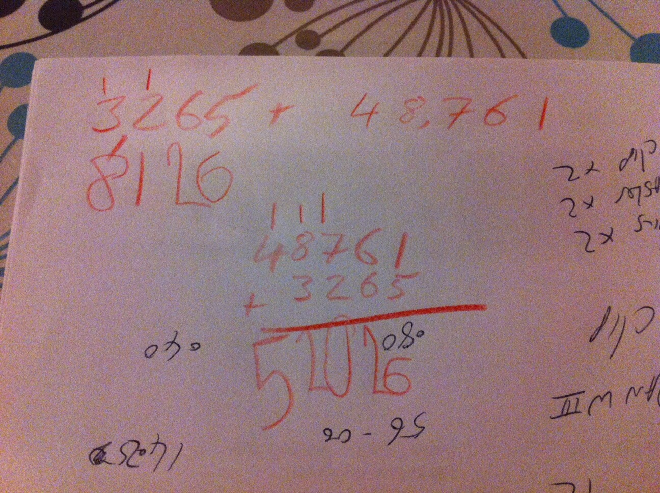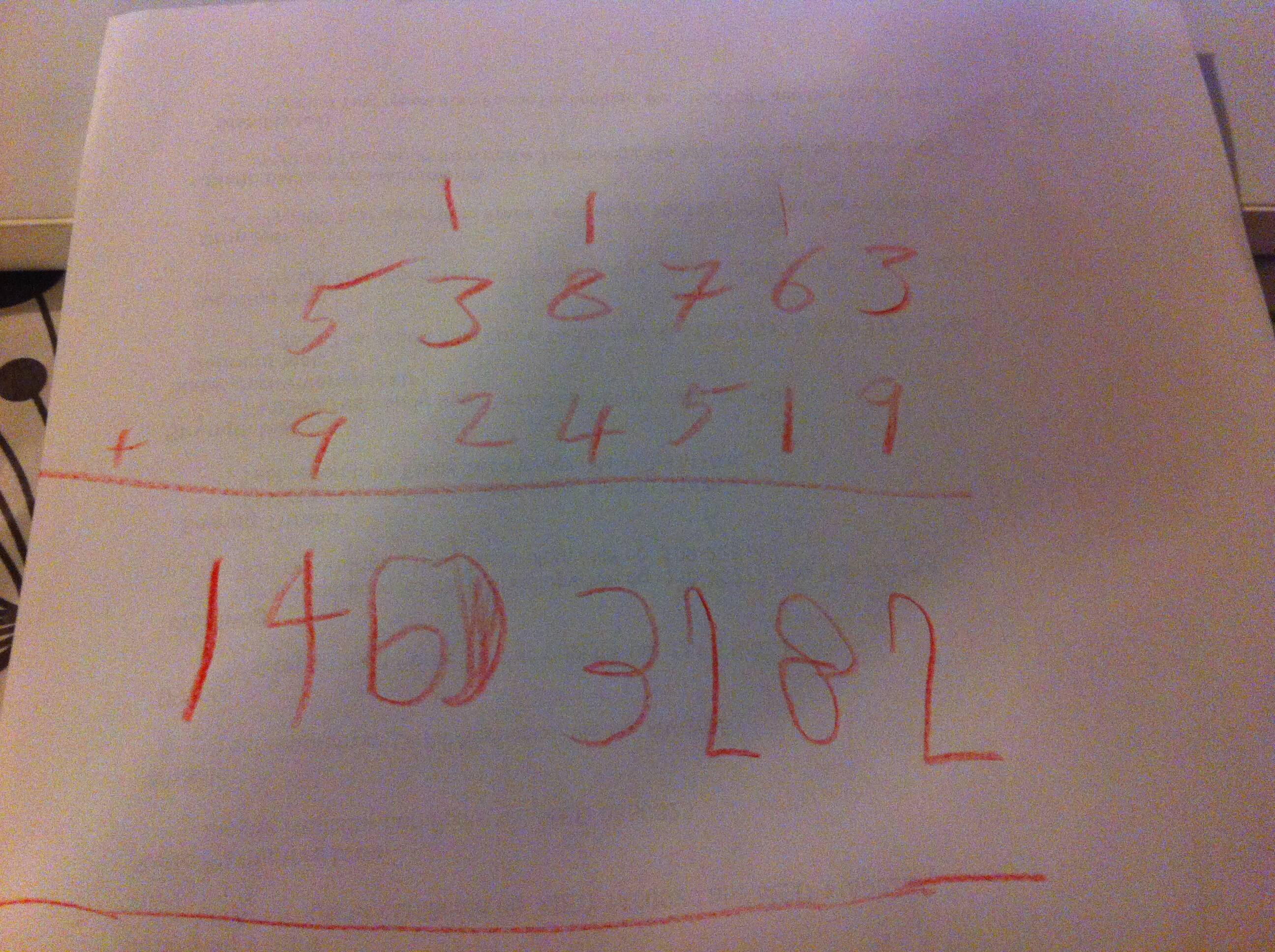 So after we stopped going *wow* at her, she chose to write up some of her own 4 digit addition equations and proceeded to do those. And the fact that she did pretty well with those inspired Mr Oh Waily to go the whole hog and he wrote out a really silly equation for her to do. And she did it, even with a bit of self-correction mid-way through.