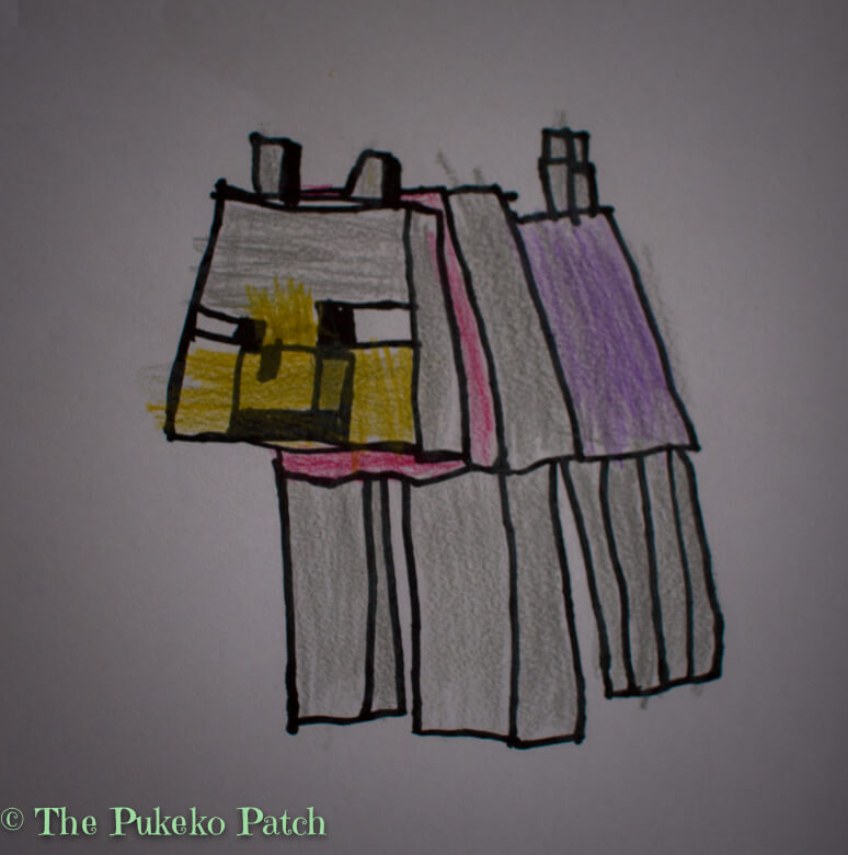 And then she finished off with a Minecraft drawing, in homage to an effort to find a wolf to tame that she had made earlier in the morning.